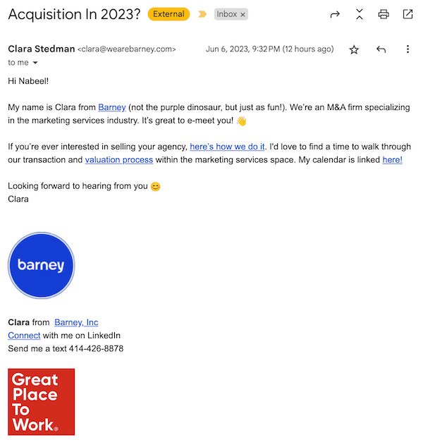 Relevant benefit in the subject line got me to open the email. I'm not interested in selling my agency right now but it's on every agency owner's mind.