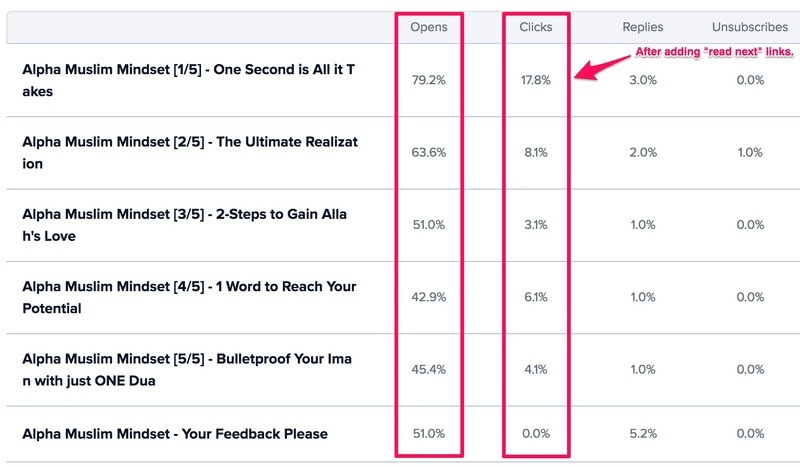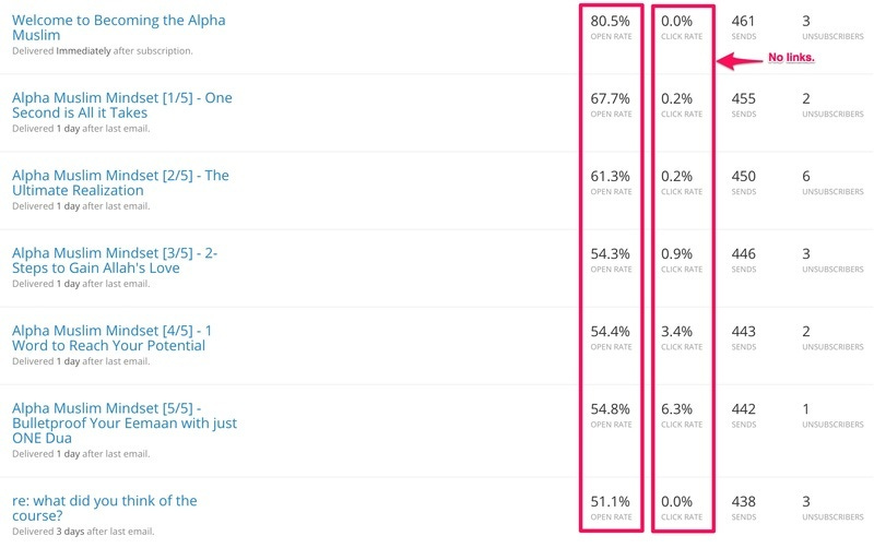 The current average for the email course pictured above is 56% open-rate, 7% click-through rate. (Update for new readers: after Apple mail privacy updates you want a new subscriber welcome campaign to hit 60-80% open rates.)